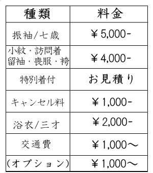 | 留袖 | 着物、帯、 長襦袢(半襟付き)、着物下着(裾よけ 肌襦袢)、 紐4〜5本、 伊達締め2本、帯揚げ 帯締め(白色)、衿芯、 帯枕、 帯板、フェイスタオル2〜3本、末広、 草履、足袋 |